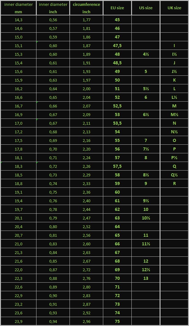 Chart of circumferences, diameters and ringsizes: